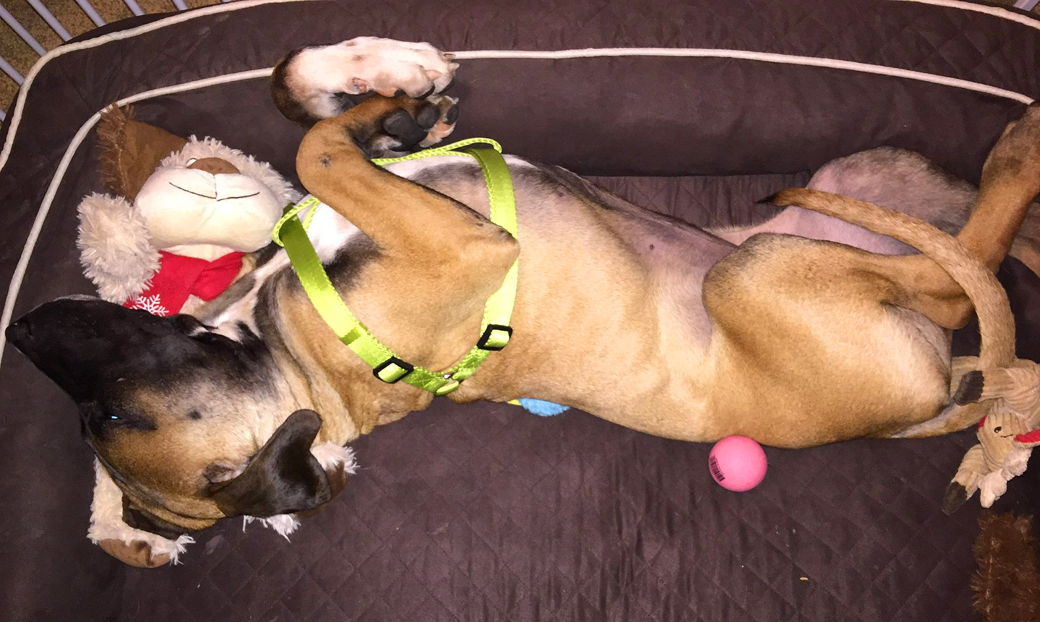 Pocket enjoying all the trappings of his new life, including a leisurely sunbath, something he’d never had the chance to experience at the horrible dog farm. Photo credit: Martyn Stewart